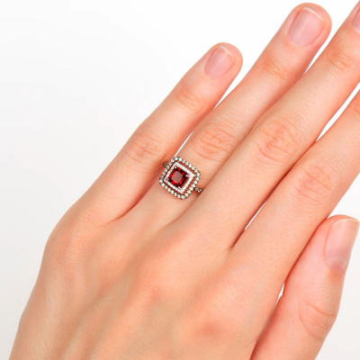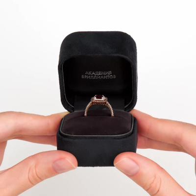 Кольцо с 24 бриллиантами природными, 0.05 карат, огранка круг 17 граней, цвет 2, чистота 2, тип огранки А; 1 гранатом природным, 0.77 карат; 46 бриллиантами коньячными природными, 0.18 карат, огранка круг 57 граней, цвет 7, чистота 5, тип огранки А; Розовое золото 585 пробы.