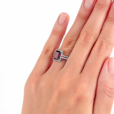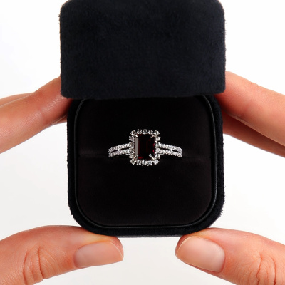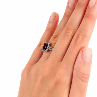 Кольцо с 40 бриллиантами природными, 0.16 карат, огранка круг 17 граней, цвет 2, чистота 2, тип огранки А; 1 родолитом природным, 1.9 карат; 18 сапфирами бесцветными природными, 0.34 карат; Белое золото 585 пробы.