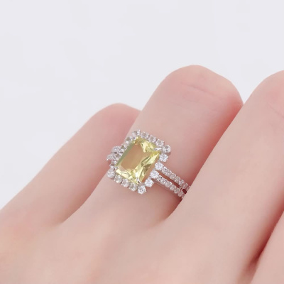 Кольцо с 40 бриллиантами природными, 0.14 карат, огранка круг 17 граней, цвет 2, чистота 2, тип огранки А; 1 кварцем лимонным природным, 1.37 карат; 18 сапфирами бесцветными природными, 0.34 карат; Белое золото 585 пробы.