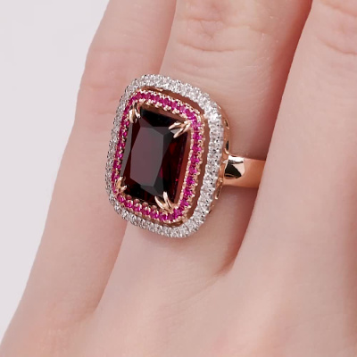 Кольцо с 40 бриллиантами природными, 0.26 карат, огранка круг 17 граней, цвет 2, чистота 2, тип огранки А; 1 гранатом природным, 3.37 карат; 32 рубинами синтетическими, 0.26 карат; Розовое золото 585 пробы.