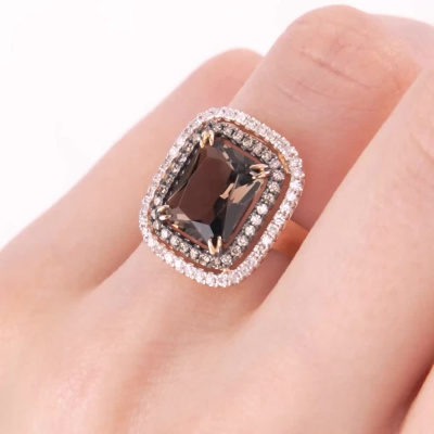 Кольцо с 40 бриллиантами природными, 0.26 карат, огранка круг 17 граней, цвет 2, чистота 2, тип огранки А; 1 кварцем дымчатым природным, 2.82 карат; 32 бриллиантами коньячными природными, 0.2 карат, огранка круг 57 граней, цвет 7, чистота 6, тип огранки А; Розовое золото 585 пробы.