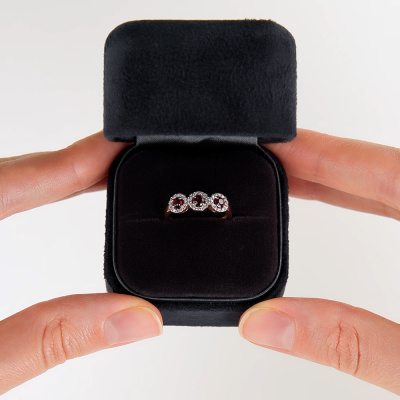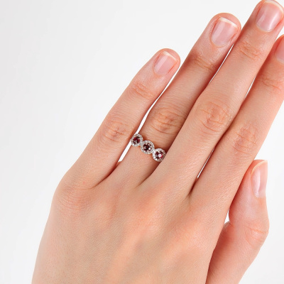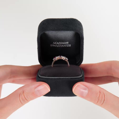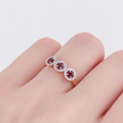 Кольцо с 36 бриллиантами природными, 0.14 карат, огранка круг 17 граней, цвет 2, чистота 2, тип огранки А; 3 родолитами природными, 0.51 карат; Розовое золото 585 пробы.