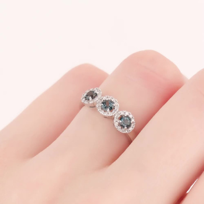 Кольцо с 36 бриллиантами природными, 0.14 карат, огранка круг 17 граней, цвет 2, чистота 2, тип огранки А; 3 топазами лондон природными, 0.45 карат; Белое золото 585 пробы.
