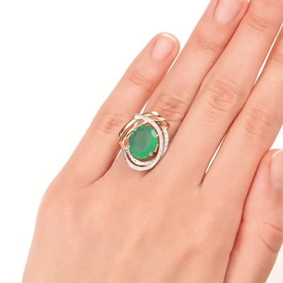 Кольцо с 52 бриллиантами природными, 0.146 карат, огранка круг 17 граней, цвет 2, чистота 2, тип огранки А; 1 ониксом зеленым природным, 4.288 карат; Розовое золото 585 пробы.