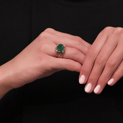 Кольцо с 20 бриллиантами природными, 0.07 карат, огранка круг 17 граней, цвет 2, чистота 2, тип огранки А; 1 ониксом зеленым природным, 4.25 карат; Розовое золото 585 пробы.