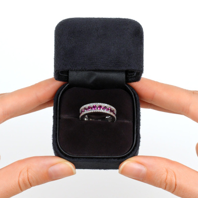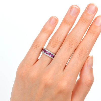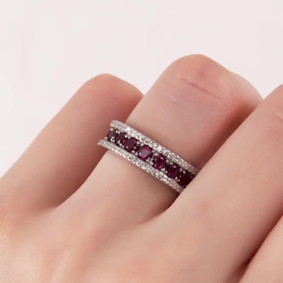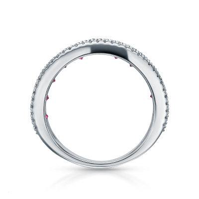 Кольцо с 70 бриллиантами природными, 0.19 карат, огранка круг 17 граней, цвет 2, чистота 2, тип огранки А; 11 родолитами природными, 1.73 карат; Белое золото 585 пробы.