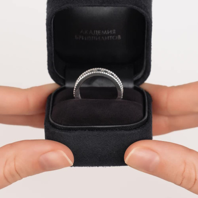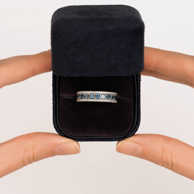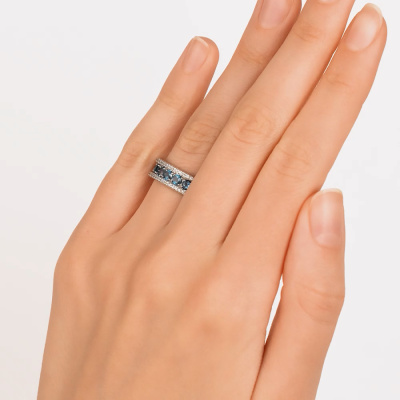 Кольцо с 70 бриллиантами природными, 0.17 карат, огранка круг 17 граней, цвет 2, чистота 2, тип огранки А; 11 топазами лондон природными, 1.39 карат; Белое золото 585 пробы.