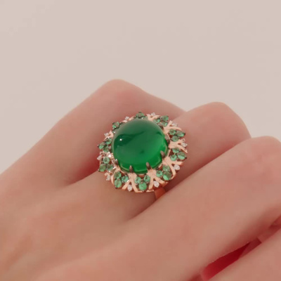 Кольцо с 10 бриллиантами природными, 0.04 карат, огранка круг 17 граней, цвет 2, чистота 2, тип огранки А; 10 изумрудами природными, 0.18 карат, цвет 3, чистота 3, тип огранки В; 20 изумрудами природными, 0.18 карат, цвет 3, чистота 3, тип огранки В; 1 агатом зеленым природным, тип огранки Б; Розовое золото 585 пробы.