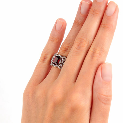 Кольцо с 56 бриллиантами природными, 0.22 карат, огранка круг 17 граней, цвет 2, чистота 2, тип огранки А; 60 бриллиантами природными, 0.15 карат, огранка круг 17 граней, цвет 2, чистота 2, тип огранки А; 1 родолитом природным, 2.11 карат, тип огранки Б; Белое золото 585 пробы.