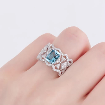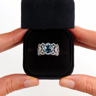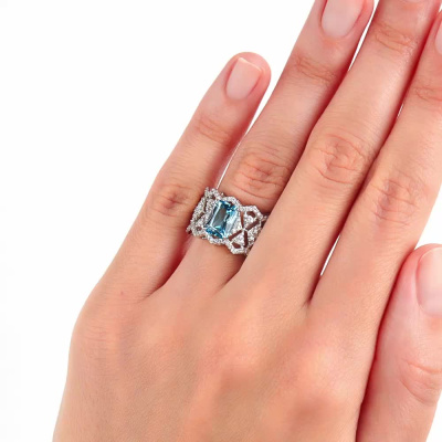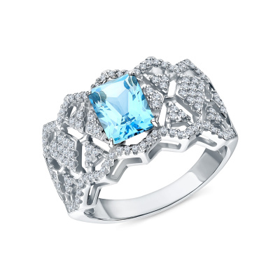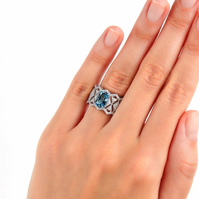 Кольцо с 56 бриллиантами природными, 0.23 карат, огранка круг 17 граней, цвет 2, чистота 2, тип огранки А; 60 бриллиантами природными, 0.16 карат, огранка круг 17 граней, цвет 2, чистота 2, тип огранки А; 1 топазом свисс природным, 1.89 карат, тип огранки Б; Белое золото 585 пробы.