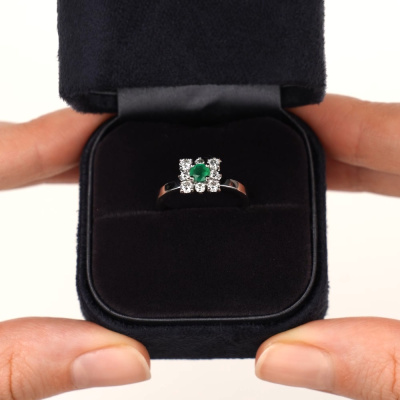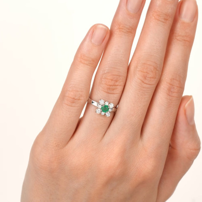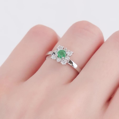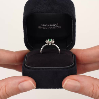 Кольцо с 4 бриллиантами природными, 0.25 карат, огранка круг 57 граней, цвет 4, чистота 5, тип огранки А; 4 бриллиантами природными, 0.12 карат, огранка круг 57 граней, цвет 4, чистота 5, тип огранки А; 1 изумрудом природным, 0.21 карат, цвет 3, чистота 3, тип огранки В; Белое золото 585 пробы.