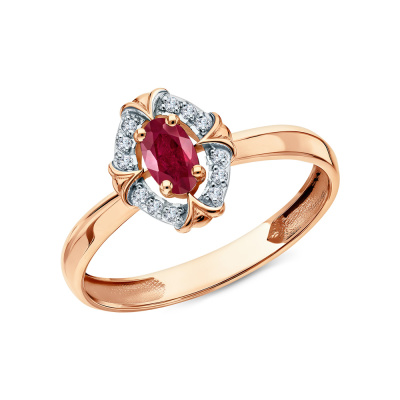 Кольцо с 12 бриллиантами природными, 0.04 карат, огранка круг 57 граней, цвет 4, чистота 5, тип огранки А; 1 рубином природным, 0.28 карат, цвет 2, чистота 2, тип огранки Б; Розовое золото 585 пробы.