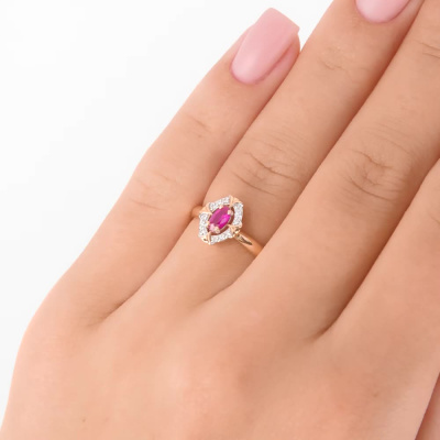Кольцо с 12 бриллиантами природными, 0.03 карат, огранка круг 57 граней, цвет 4, чистота 5, тип огранки А; 1 рубином природным, 0.28 карат, цвет 2, чистота 2, тип огранки Б; Розовое золото 585 пробы.