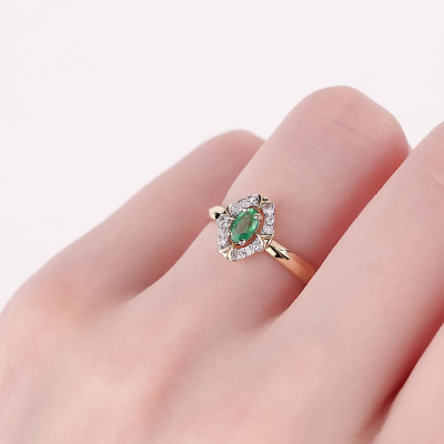 Кольцо с 12 бриллиантами природными, 0.04 карат, огранка круг 57 граней, цвет 4, чистота 5, тип огранки А; 1 изумрудом природным, 0.2 карат, цвет 3, чистота 3, тип огранки Б; Желтое золото 585 пробы.