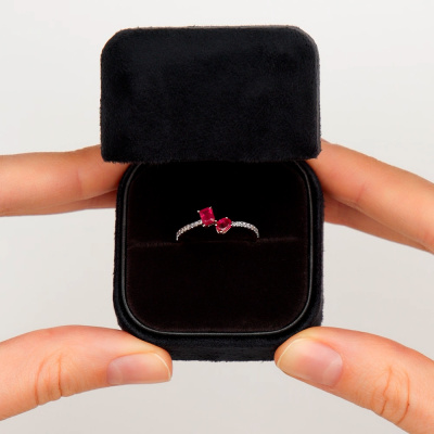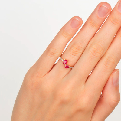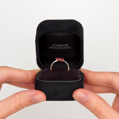 Кольцо с 20 бриллиантами природными, 0.11 карат, огранка круг 17 граней, цвет 2, чистота 3; 1 рубином природным, 0.21 карат, цвет 3, чистота 4; 1 рубином природным, 0.2 карат, цвет 3, чистота 4; Розовое золото 585 пробы.