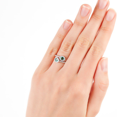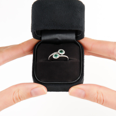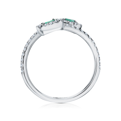 Кольцо с 48 бриллиантами природными, 0.29 карат, огранка круг 17 граней, цвет 2, чистота 3; 2 изумрудами природными, 0.31 карат, цвет 4, чистота 3; Белое золото 585 пробы.