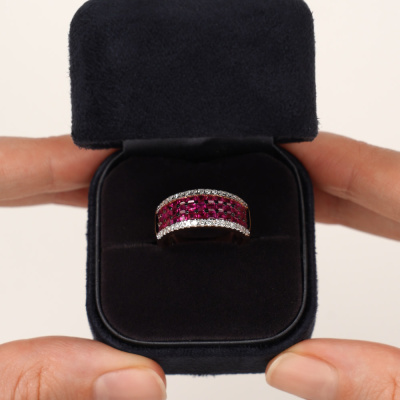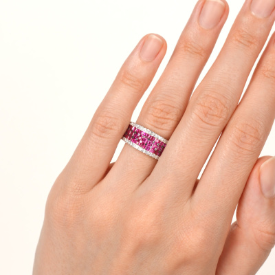 Кольцо с 38 бриллиантами природными, 0.25 карат, огранка круг 17 граней, цвет 2, чистота 3; 39 рубинами природными, 1.79 карат, цвет 3, чистота 4; Розовое золото 585 пробы.