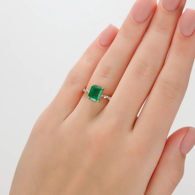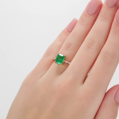 Кольцо с 8 бриллиантами природными, 0.06 карат, огранка круг 17 граней, цвет 2, чистота 3; 1 изумрудом природным, 2.484 карат, цвет 4, чистота 3; Желтое золото 585 пробы.