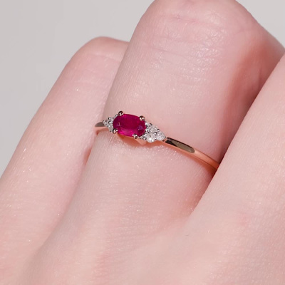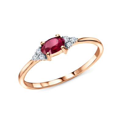 Кольцо с 6 бриллиантами природными, 0.04 карат, огранка круг 17 граней, цвет 2, чистота 3, тип огранки Б; 1 рубином природным, 0.24 карат, цвет 3, чистота 4, тип огранки Б; Розовое золото 585 пробы.