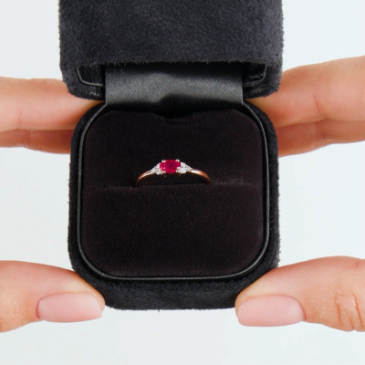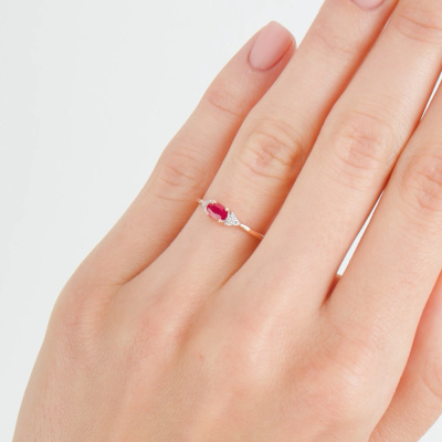 Кольцо с 6 бриллиантами природными, 0.04 карат, огранка круг 17 граней, цвет 2, чистота 3; 1 рубином природным, 0.24 карат, цвет 3, чистота 4; Розовое золото 585 пробы.
