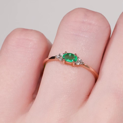 Кольцо с 6 бриллиантами природными, 0.04 карат, огранка круг 17 граней, цвет 2, чистота 3, тип огранки Б; 1 изумрудом природным, 0.21 карат, цвет 4, чистота 3, тип огранки Б; Розовое золото 585 пробы.