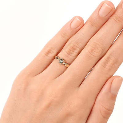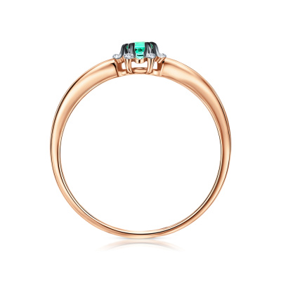 Кольцо с 6 бриллиантами природными, 0.01 карат, огранка круг 17 граней, цвет 2, чистота 3; 1 изумрудом природным, 0.08 карат, цвет 4, чистота 3; Желтое золото 585 пробы.