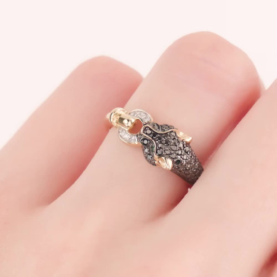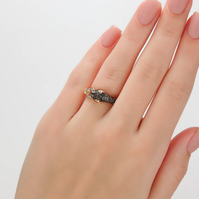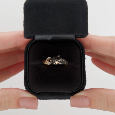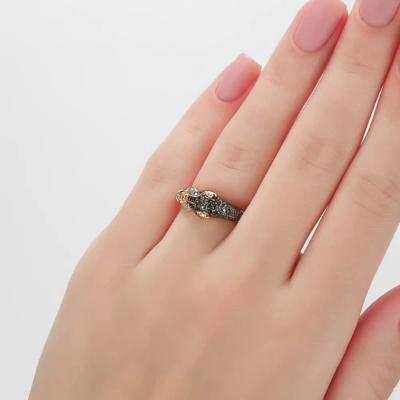 Кольцо с 6 бриллиантами природными, 0.02 карат, огранка круг 17 граней, цвет 2, чистота 3, тип огранки А; 2 бриллиантами черными природными облагороженными, 0.01 карат, огранка круг 57 граней, цвет 7, чистота 6, тип огранки А; 2 изумрудами природными, 0.01 карат, цвет 3, чистота 3, тип огранки Б; 78 бриллиантами черными природными облагороженными, 0.35 карат, огранка круг 57 граней, цвет 7, чистота 6, тип огранки А; Желтое золото 585 пробы.