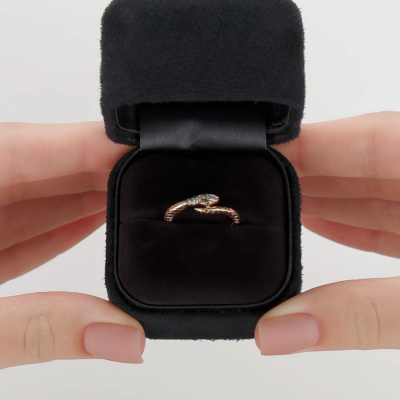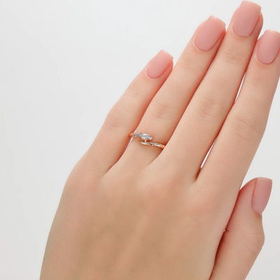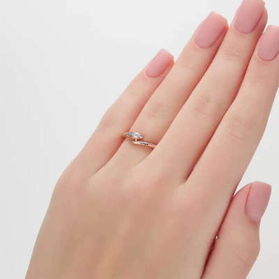 Кольцо с 11 бриллиантами природными, 0.03 карат, огранка круг 17 граней, цвет 2, чистота 2, тип огранки А; 1 бриллиантом природным, 0.002 карат, огранка круг 17 граней, цвет 2, чистота 2, тип огранки А; 2 гидротермальными изумрудами, 0.008 карат; Розовое золото 585 пробы.