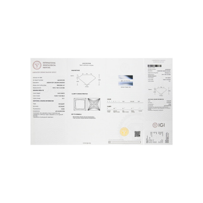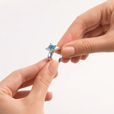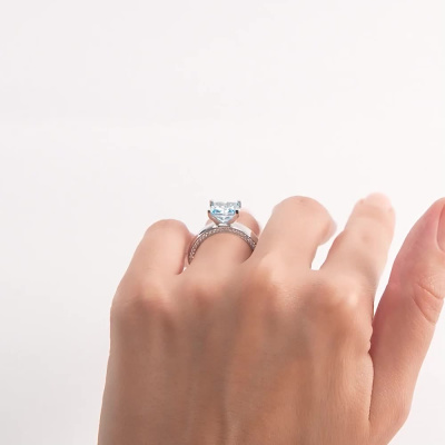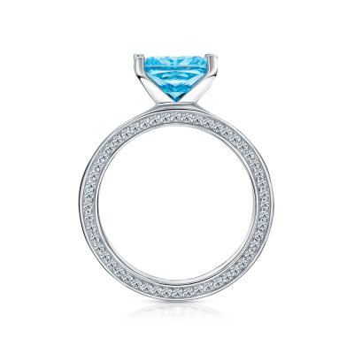 Кольцо с 1 бриллиантом выращенным, 3.23 карат, огранка принцесса 65 граней, цвет Голубой, чистота 5, тип огранки А; 104 бриллиантами выращенными, 0.35 карат, огранка круг 57 граней, цвет 3, чистота 5, тип огранки А; Белое золото 585 пробы.