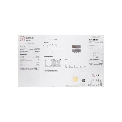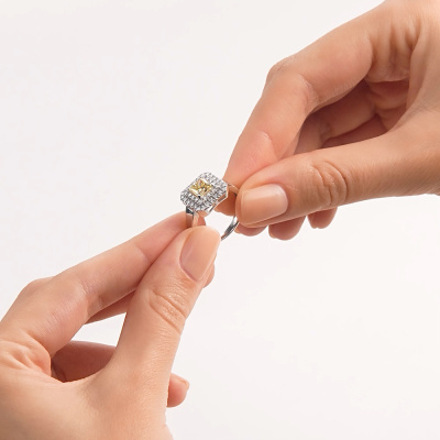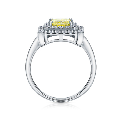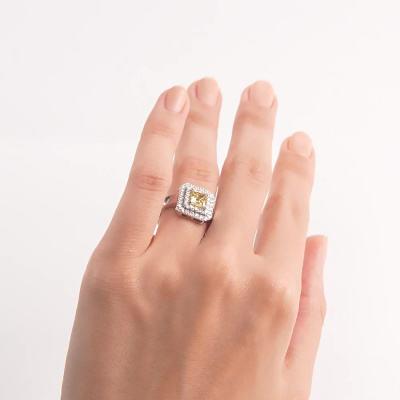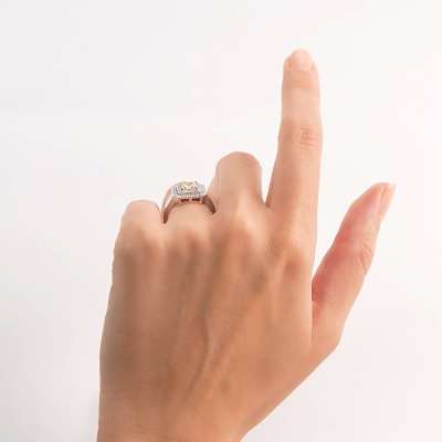 Кольцо с 1 бриллиантом выращенным, 1.02 карат, огранка принцесса 65 граней, цвет Желтый, чистота 5, тип огранки А; 40 бриллиантами выращенными, 0.31 карат, огранка круг 57 граней, цвет 2, чистота 4, тип огранки А; Белое золото 585 пробы.