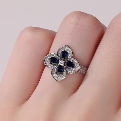 Кольцо с 1 бриллиантом природным, 0.03 карат, огранка круг 57 граней, цвет 3, чистота 6, тип огранки А; 12 бриллиантами природными, 0.09 карат, огранка круг 57 граней, цвет 3, чистота 6, тип огранки А; 16 бриллиантами природными, 0.07 карат, огранка круг 17 граней, цвет 2, чистота 2, тип огранки А; 32 бриллиантами природными, 0.08 карат, огранка круг 17 граней, цвет 2, чистота 2, тип огранки А; 4 сапфирами природными, 0.88 карат, цвет 2, чистота 2, тип огранки Б; Белое золото 585 пробы.
