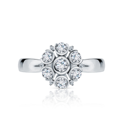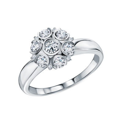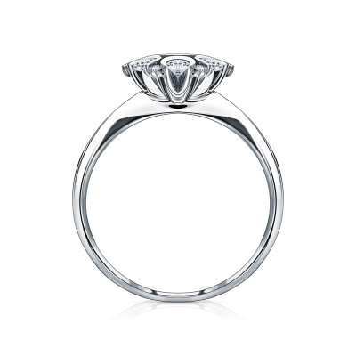 Кольцо с 1 бриллиантом природным, 0.11 карат, огранка круг 57 граней, цвет 3, чистота 6, тип огранки А; 6 бриллиантами природными, 0.48 карат, огранка круг 57 граней, цвет 3, чистота 6, тип огранки А; 6 бриллиантами природными, 0.04 карат, огранка круг 57 граней, цвет 3, чистота 6, тип огранки А; Белое золото 585 пробы.