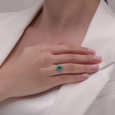 Кольцо с 28 бриллиантами природными, 0.41 карат, огранка круг 57 граней, цвет 3, чистота 6, тип огранки А; 1 изумрудом природным, 1.14 карат, цвет 3, чистота 3, тип огранки Б; Желтое золото 585 пробы.
