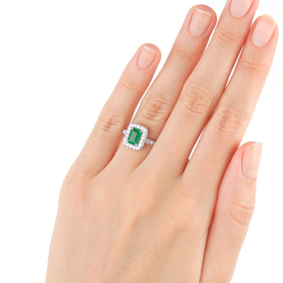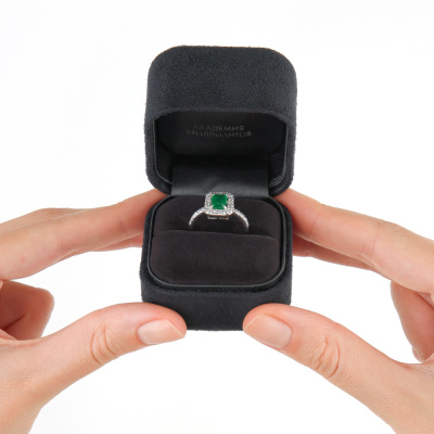 Кольцо с 1 изумрудом, 1.03 карат, цвет 3, чистота 3, тип огранки Б; 28 бриллиантами, 0.42 карат, огранка круг 57 граней, цвет 3, чистота 6, тип огранки А; Белое золото 585 пробы.