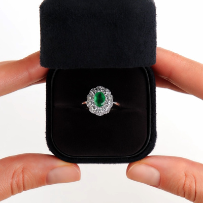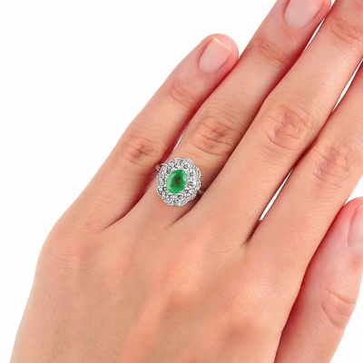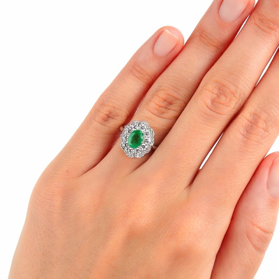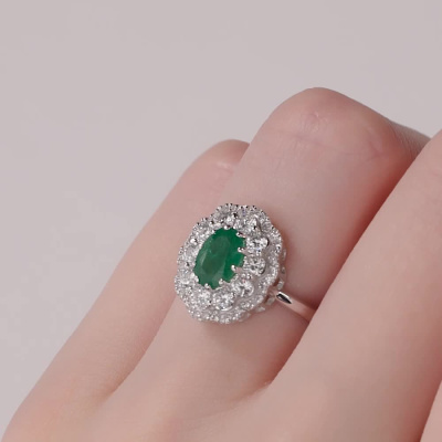 Кольцо с 10 бриллиантами природными, 0.55 карат, огранка круг 57 граней, цвет 3, чистота 6, тип огранки А; 36 бриллиантами природными, 0.11 карат, огранка круг 17 граней, цвет 2, чистота 2, тип огранки Б; 1 изумрудом природным, 0.61 карат, цвет 3, чистота 3, тип огранки Б; Белое золото 585 пробы.