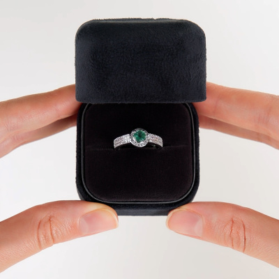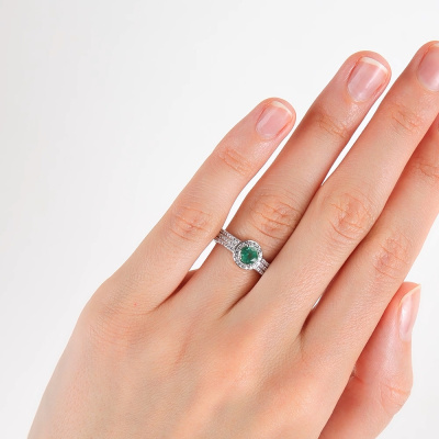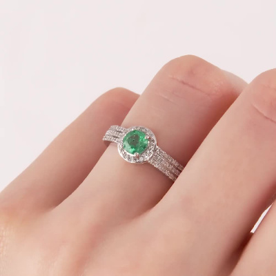 Кольцо с 78 бриллиантами природными, 0.3 карат, огранка круг 17 граней, цвет 2, чистота 3; 1 изумрудом природным, 0.43 карат, цвет 3, чистота 3; Белое золото 585 пробы.