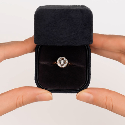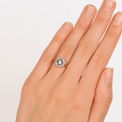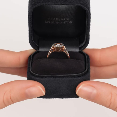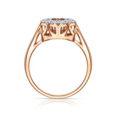 Кольцо с 1 бриллиантом природным, 0.03 карат, огранка круг 57 граней, цвет 4, чистота 6, тип огранки А; 24 бриллиантами природными, 0.1 карат, огранка круг 17 граней, цвет 2, чистота 2, тип огранки А; Розовое и белое золото 585 пробы.