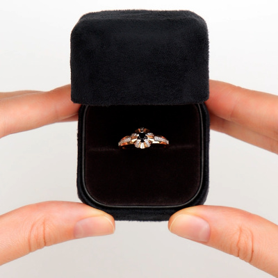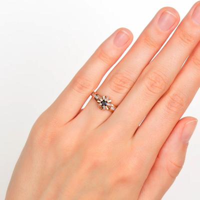 Кольцо с 29 бриллиантами природными, 0.1 карат, огранка круг 17 граней, цвет 2, чистота 2, тип огранки Б; 1 сапфиром природным, 0.18 карат, цвет 2, чистота 2, тип огранки В; Розовое золото 585 пробы.
