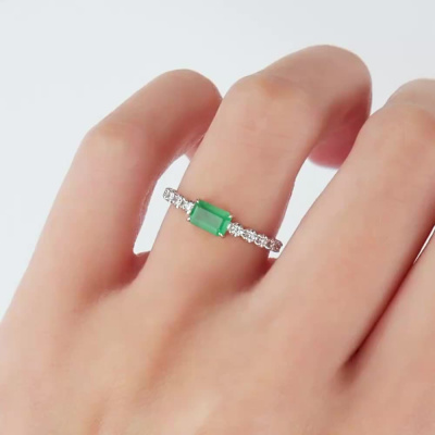 Кольцо с 10 бриллиантами природными, 0.13 карат, огранка круг 57 граней, цвет 3, чистота 6, тип огранки А; 1 изумрудом природным, 0.48 карат, цвет 3, чистота 3, тип огранки Б; Белое золото 585 пробы.