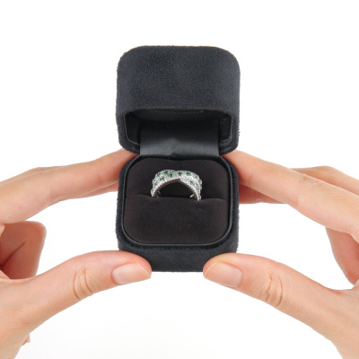 Кольцо с 126 бриллиантами природными, 0.38 карат, огранка круг 17 граней, цвет 2, чистота 2, тип огранки А; 15 изумрудами природными, 0.41 карат, цвет 3, чистота 3, тип огранки В; Белое золото 585 пробы.