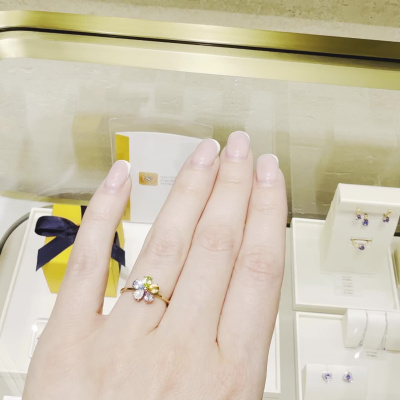 Кольцо с 5 бриллиантами природными, 0.01 карат, огранка круг 17 граней, цвет 2, чистота 2, тип огранки А; 1 топазом свисс природным, 0.18 карат; 1 хризолитом природным, 0.16 карат; 1 аметистом природным, 0.13 карат; 1 цитрином природным, 0.11 карат; Розовое золото 585 пробы.