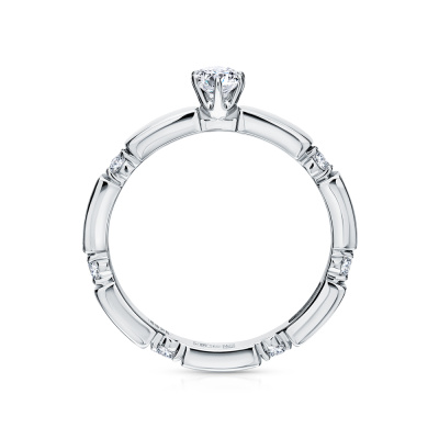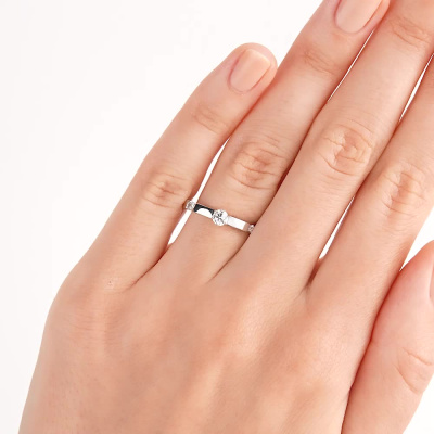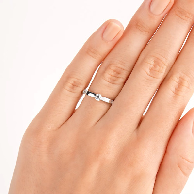 Кольцо с 1 бриллиантом природным, 0.16 карат, огранка круг 57 граней, цвет 3, чистота 6, тип огранки А; 6 бриллиантами природными, 0.19 карат, огранка круг 57 граней, цвет 3, чистота 6, тип огранки А; Белое золото 585 пробы.