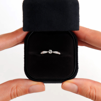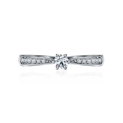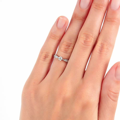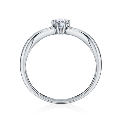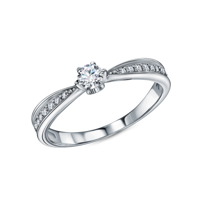 Кольцо с 1 бриллиантом природным, 0.14 карат, огранка круг 57 граней, цвет 3, чистота 6, тип огранки А; 8 бриллиантами природными, 0.04 карат, огранка круг 57 граней, цвет 3, чистота 6, тип огранки А; 4 бриллиантами природными, 0.01 карат, огранка круг 17 граней, цвет 2, чистота 2, тип огранки А; Белое золото 585 пробы.