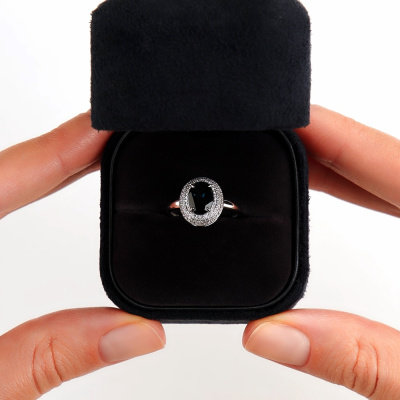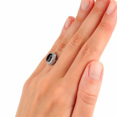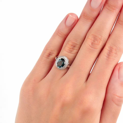 Кольцо с 98 бриллиантами природными, 0.18 карат, огранка круг 17 граней, цвет 2, чистота 2, тип огранки А; 1 топазом лондон природным, 1.45 карат; Белое золото 585 пробы.