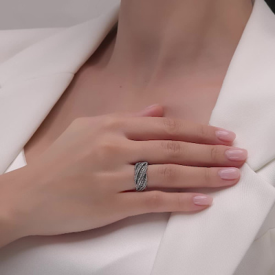 Кольцо с 154 бриллиантами природными, 0.39 карат, огранка круг 17 граней, цвет 2, чистота 2, тип огранки А; 3 бриллиантами коньячными природными, 0.03 карат, огранка круг 57 граней, цвет 7, чистота 5, тип огранки А; 14 бриллиантами коньячными природными, 0.09 карат, огранка круг 57 граней, цвет 7, чистота 5, тип огранки А; 6 бриллиантами коньячными природными, 0.02 карат, огранка круг 57 граней, цвет 7, чистота 5, тип огранки А; Белое золото 585 пробы.