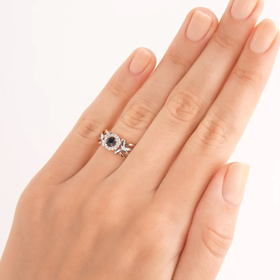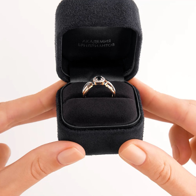 Кольцо с 14 бриллиантами природными, 0.07 карат, огранка круг 17 граней, цвет 2, чистота 2, тип огранки А; 1 сапфиром природным, 0.18 карат, цвет 2, чистота 2, тип огранки В; Розовое золото 585 пробы.