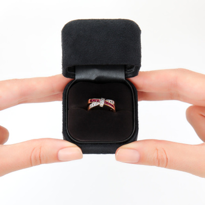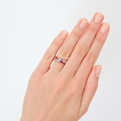 Кольцо с 8 рубинами синтетическими, 0.45 карат; 8 сапфирами бесцветными природными, 0.19 карат; 2 сапфирами бесцветными природными, 0.03 карат; Розовое золото 585 пробы.