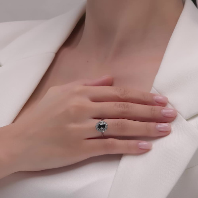 Кольцо с 12 бриллиантами природными, 0.15 карат, огранка круг 57 граней, цвет 3, чистота 6, тип огранки А; 12 бриллиантами природными, 0.1 карат, огранка круг 57 граней, цвет 3, чистота 6, тип огранки А; 1 сапфиром природным, 0.79 карат, цвет 2, чистота 2, тип огранки Б; Белое золото 585 пробы.