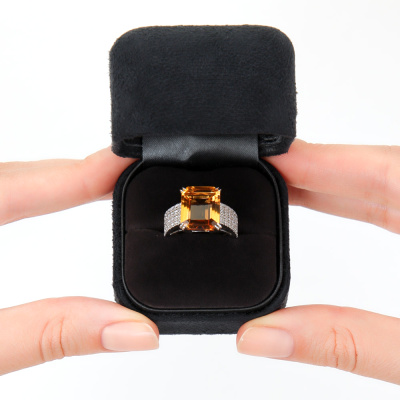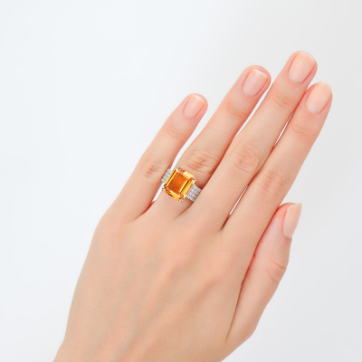 Кольцо с 52 бриллиантами природными, 0.39 карат, огранка круг 57 граней, цвет 3, чистота 6, тип огранки А; 1 цитрином природным, 6.84 карат; Белое золото 585 пробы.