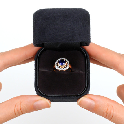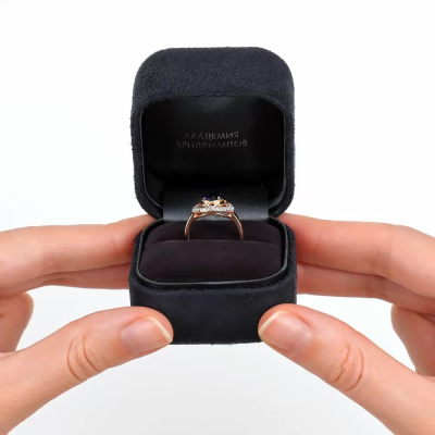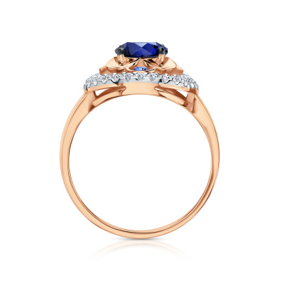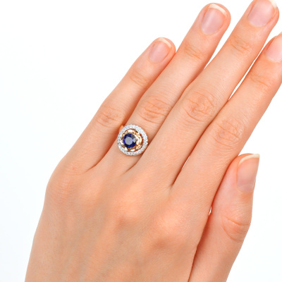 Кольцо с 28 бриллиантами природными, 0.14 карат, огранка круг 17 граней, цвет 2, чистота 2, тип огранки А; 1 сапфиром синтетическим, 1.01 карат; Розовое золото 585 пробы.